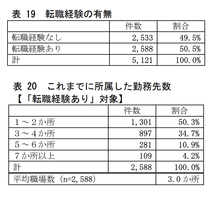 日本看護協会の2021年病院実態調査によると、転職した経験がある人は全体で50,5%、これまでに経験した勤務先数は1〜3か所が最も多く、平均3か所です。この結果から転職回数は平均約3回となります。